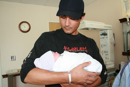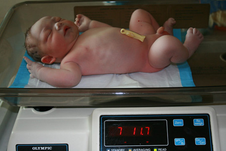 At about 3:30 three nurses came rushing in and immediately moved me to my side.  They seemed pretty frantic, and apparently the baby’s heart rate had quickly fallen.  Apparently the cord was wraped around his neck. They had to do some fancy footwork to raise it again, and eventually did.  At about 4:00 Dr. Thein showed up and started to get the room ready for delivery.  I started pushing at about 4:15pm.  I had three contractions.  Between two and three I had a small upchuck session.  On contraction three, and at 4:23 pm on April 30th I delivered Scout Kei Denison!