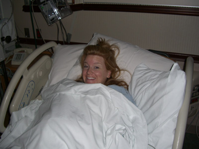When I got there, I was already having contractions about six minutes apart.  The nurse asked me on a scale of 1 - 10 how painful they were, and I said about a one.  (A five is equivalent to a really bad migraine headache.)  They then gave me a pill to thin my cervix, and afterward I was supposed to sleep until the morning.  Micah had a chair that turned into a bed and slept pretty well.  But when he woke up, he did tell me that his back was “about a 5″.  Somehow, he takes the whole “sympathy pregnancy” thing a little far!  I, on the other hand, had nurses coming in every thirty minutes to poke and prod me and move my baby’s heart rate monitor around….which made my night’s sleep pretty lousy.