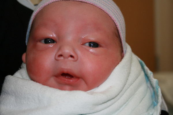 He was perfect!  Because the cord was wrapped around his head, he was a bit blue.  They immediately put him on oxygen for a few minutes and then cleaned him up.  He screamed about three times, but other than that he just had his eyes wide open and was looking at everything.  Because the delivery was so quick, he didn’t have a cone head!