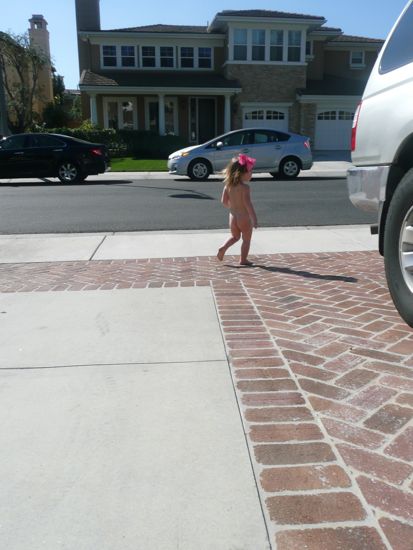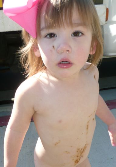 I couldn’t find the little twirps for about five minutes — so I finally opened the window to listen outside. I heard their little giggles, so headed out myself to scold them for leaving the house without permission. When I went outside, I found a diaper — messy diaper — laying on the sidewalk. Then I saw this little thing running all over the place in celebration of her new found freedom, giggling, playing a game with Scout….and finger-painted with her nastiness all over.