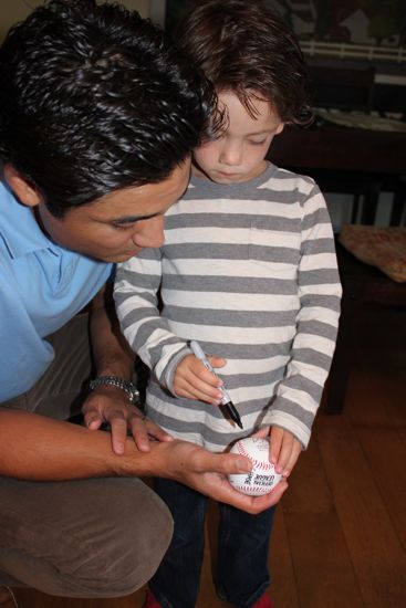 Scout got to sign three coach’s balls. Too bad for the late comers that he took about 1/4 of the ball with his handwriting!