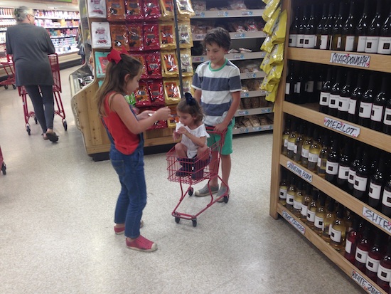When I walked into Trader Joe’s, all of my kids dispersed. I figured it was to find the monkey to get a sucker, but instead, they all went to get a mini cart. When I saw three kids coming towards me with mini carts, I told them that there is only one per family. So after two mini carts were returned, I noticed that Pippi was the lucky one who got to push it. but then I noticed that her cart was full of everything that was at her eye level, such as polenta, jalepenos, jam, and soon-to-be wheat pasta. My eyes got big, and I stopped Scout from laughing and told him to “put it all away and stop the madness”!