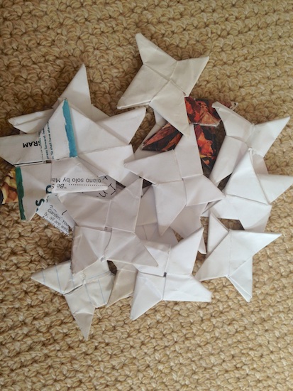 Today, I happened upon a collection of Ninja stars made out of the church programs we get each week.