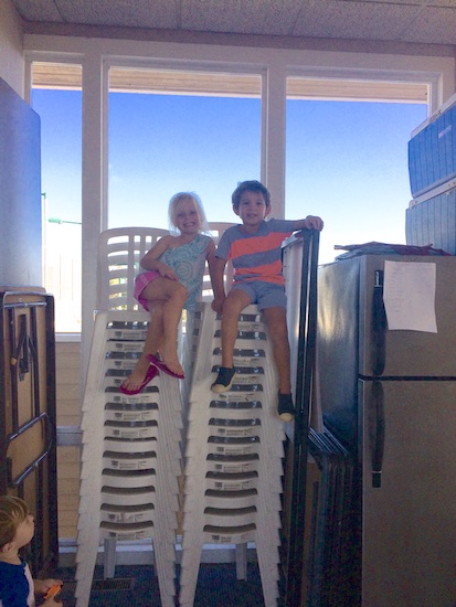 While I watch Scout and Navy practice tennis, Dash has found a little friend names Lyla.  They play together, and entertain each other enough to make their mom’s lives easier.  But when Lyla’s mom went to check on them, she took this picture of them being where they weren’t supposed to be.  And she told me that she asked Lyla what gave her the really bad idea to climb those wobbly chairs.  Her answer was, “Dash”.