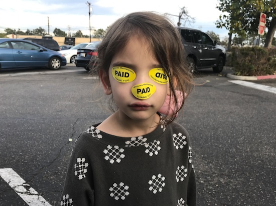 For example — she put these stickers on her eyes from the grocery store.