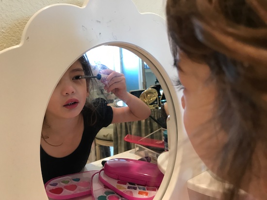 Navy was the master at makeup when she was little. I am talking from 2 years old. She applied mascara without messing up, like a pro! Well, Pippi hasn’t been gifted with the same steady hand. So with lash primer (white) she has been practicing and practicing. I told her that she might graduate to black, but she has to get better than Navy was. So basically, I am telling her — you are never getting to black — without her knowing it.