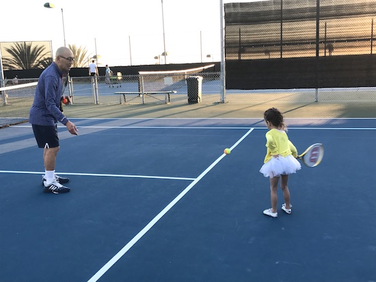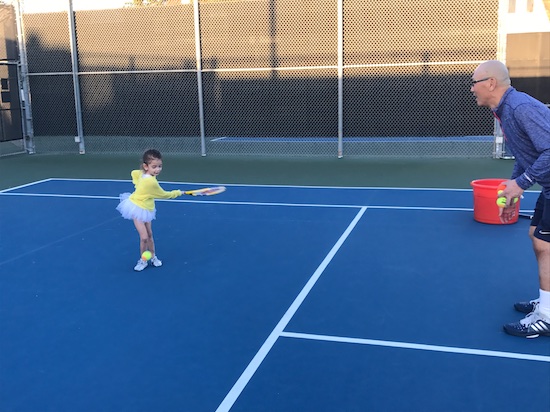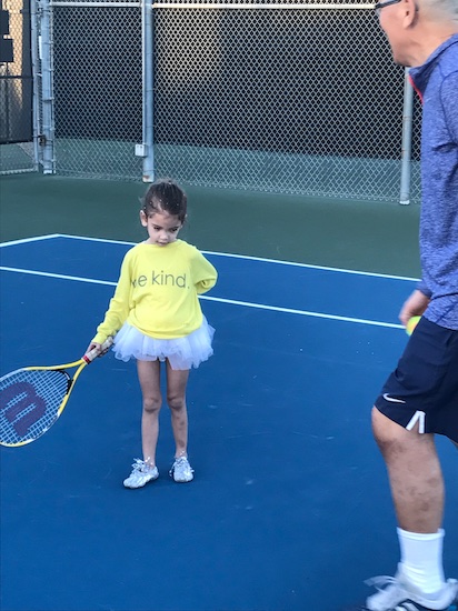 While we were at Scout and Navy’s tennis lesson, Coach Warren asked how old PIppi was. When I told him 4, he asked for a few minutes with her after class to see how close she is to lessons. I was thrilled because they are gnarly about not starting them too young, and she was thrilled that she got to be a tennis player!
