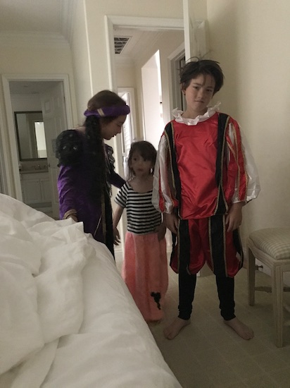 I was woken up by a 50’s girl, a queen, and a jester this morning. I was cracking up, because these costumes were all new to me. Apparently NayNay had brought over a bag of old costumes for the kids — and they were pretty good ones because they were big enough for them.