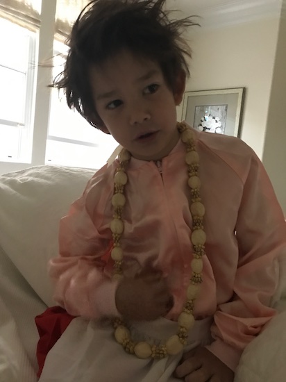 But when Dash came in with a silk shirt, red pleated cheerleader skirt and shell necklace, and said, “I love this outfit because it feels so soft”…I told him he was wearing all girl stuff to get it off of him quickly. He said was torn, as he was rubbing his hand up and down his sateen shirt. Then Scout made fun of him, and he growled, and ripped it right off!
