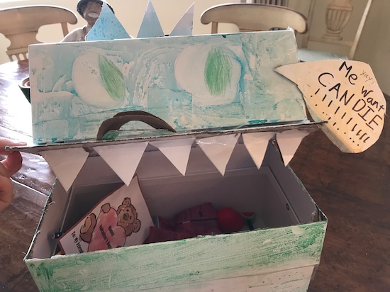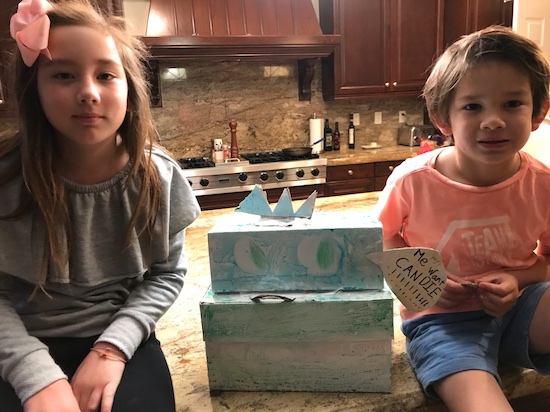 As Dash and I walked in…we were trying to figure out what to do, when we looked over to see Navy’s finishing touch — a sign that said, “Me Want Candie”. I told her that everyone was going to love her box, when she said, “Oh, I don’t get to bring a box. I made this for Dash.”