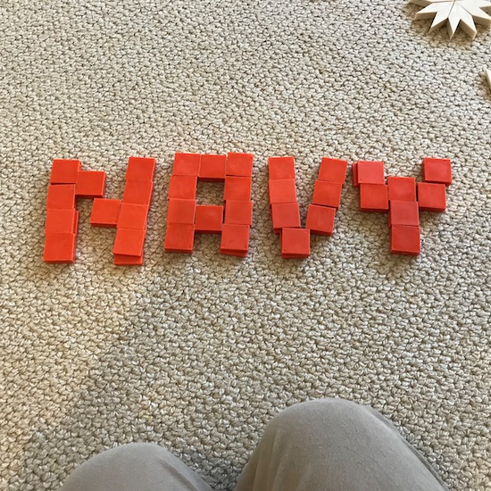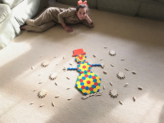 It is amazing how the kids congregate to wherever I am.  This afternoon, I was burying my nose in a book on the couch, and next to me, the pattern blocks made a rare appearance by:
