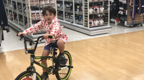 I was shopping in TJMaxx, when all of a sudden, some kid whipped by me on an actual bike. I thought to myself, “No wonder I don’t shop here often!” Then I saw the culprit…