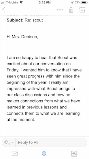 Scout’s Social Studies teacher made some nice comments to Scout last week about what a joy he is to have in class. He was so pumped up about them, he came home and told me what she had said. I always think it is good for people to hear positive feedback, so I wrote the teacher a little note thanking her for saying such kind things to Scout, and to tell her that Scout really enjoys her class.