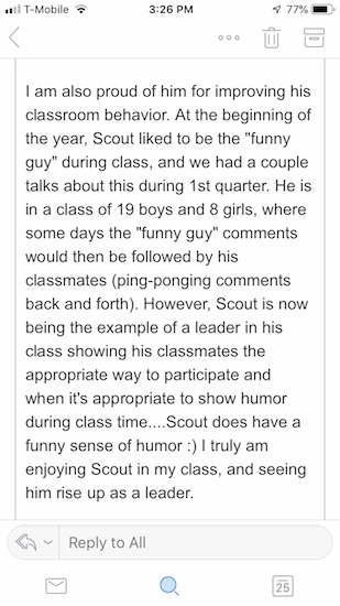 I wasn’t loving the part about him being the former class clown, but I loved the part about him rising up as a leader. I agree that Scout is a natural-born leader, and I am really grateful to teachers who see that in him, and encourage his best self!