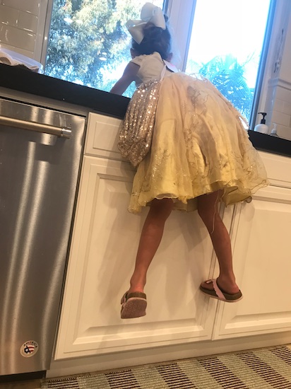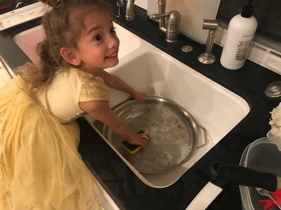 Each Sunday, we have started to play SCUM for who cleans what parts of the kitchen. It is so fun, and we get a spotless kitchen at the end of it. Unfortunately, Pippi is too little to hold her own in SCUM, so she usually hangs out near us doing something else. But today, she felt slighted on the cleaning part, and heard the moans of Dash who got the dishes…and took charge!