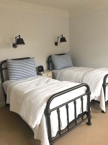 We need bed skirts, frames for the wall, roman shades, a different light on the shelf…and we might be there!