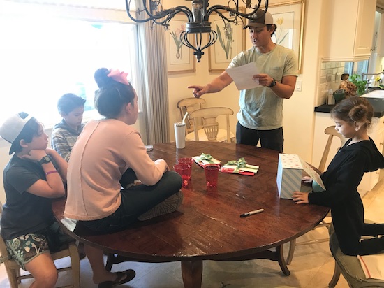 We fairly picked teams — it was Mom with the boys, and Dad with the girls. I was excited, but the stinking kids all thought dad would win..so I got a few grumbles. We then got our buffs — we were team yellow. The losers were team red. Then Micah opened the box up, and we got our set of clues.