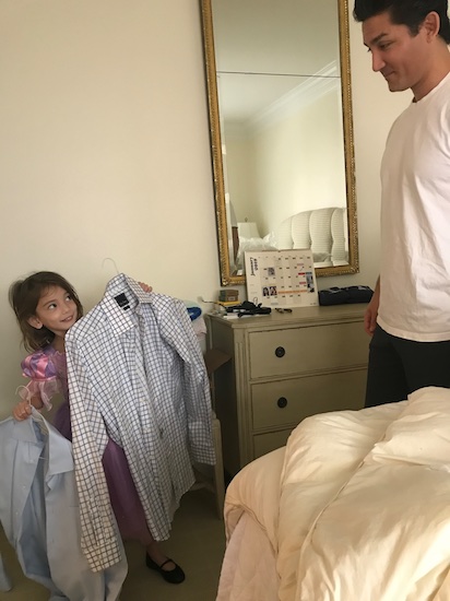 Micah turned to the best stylist we’ve got, and was soon wearing a blue windowpane dress shirt, with grey slacks.